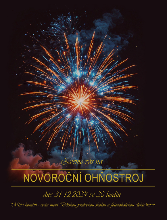 v příloze najdete pakát k ohňostroji, který se uskuteční mezi fotovoltaickou elektrárnou a Dětskou jezdeckou školou dne 31. 12. 2024 od 20:00 hodin.